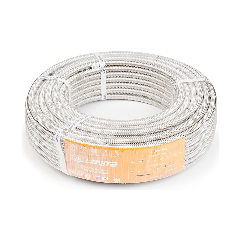 Легко сгибаемая гофрированная труба LAVITA Ду 15мм из нержавеющей стали марки AISI 304 (08X18H10) применяется в различных инженерных системах: отопление, холодоснабжение, хозяйственно-питьевое водоснабжение, системы газораспределения, спринклерное пожаротушении, защитный кабель канал для электропроводки и телекоммуникационных сетей, а также как трубопровод для перекачки жидкостей и газов, не агрессивных к нержавеющей трубе и соединительным фитингам. Труба производится в России на современном высокотехнологичном оборудовании с многоступенчатым контролем качества из корейской нержавеющей ленты марки POSCO. На российском рынке труба LAVITA уже более 7 лет и за это время давно завоевала доверие потребителя. Применяется в комплексе с соединительными фитингами LAVITA.