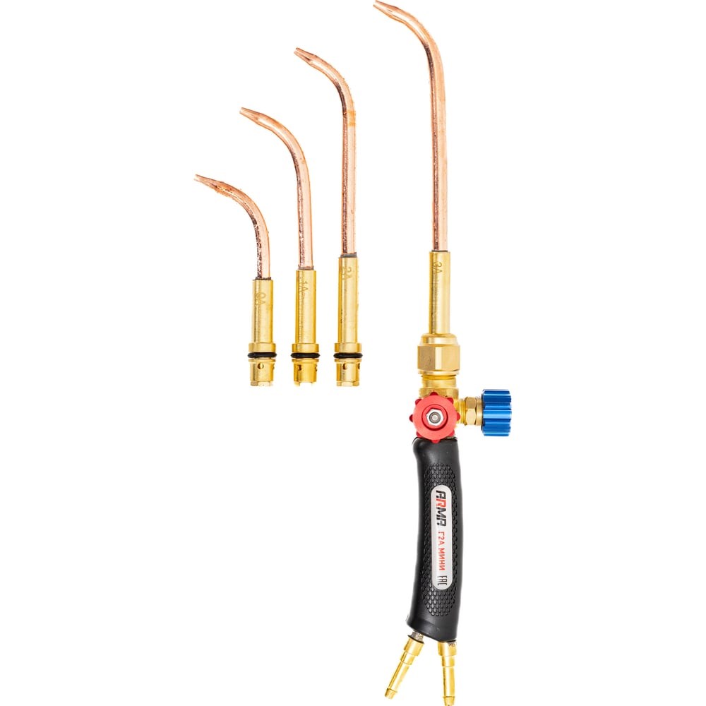 Инжекторная горелка для сварки металлов толщиной до 4 мм. Укомплектована латунными сварочными наконечниками с медными мундштуками № 0А, 1А, 2А и 3А. Горелка ацетиленовая Г2А МИНИ предназначена для сварки, пайки высокотемпературными припоями, нагрева, плавления и прочих видов газопламенной обработки металлов. На горелках установлена ручка из высокотемпературного штампованного пластика, выдерживающая температуру до 200°С, благодаря чему можно работать в тонких рукавицах. Горелка укомплектована медными цельнотянутыми наконечниками, которые позволяют выполнять работы в ограниченном пространстве и в труднодоступных местах. Точная регулировка мощности пламени в пределах одного наконечника производится вентилями, ступенчатое изменение – сменой наконечников. Особенности горелки Г2А МИНИ (№ 0А, 1А, 2А, 3А):Горелка имеет компактные размеры и облегченную конструкцию.Материал наконечников - медная цельнотянутая трубка. Это обеспечивает большую продолжительность работы без перегрева за счет улучшенного теплоотвода.Конструктивная особенность коротких загнутых «носиков» в каждом наконечнике позволяет производить сварочные работы в очень стесненных условиях, производить угловые швы.Горелка укомплектована ниппелями, что позволяет использовать резинотканевые рукава с внутренним диаметром 6 мм без дополнительных переходников, и накидными гайками M12х1,25 для подачи кислорода и M12х1,25LH для подачи ацетилена.
