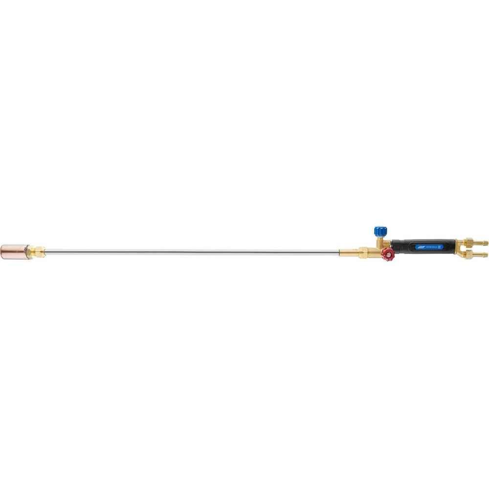 Газокислородная горелка для наплавки и нагрева металла длиной 1100 мм используется для предварительного нагрева изделий перед сваркой, наплавления материала с высокой износостойкостью на рабочую поверхность детали для увеличения ее долговечности. Горелка укомплектована латунным наконечником с медным сетчатым мундштуком № 8П. Точная регулировка мощности пламени производится вентилями. В руководстве по эксплуатации указаны ориентировочные данные. На горелке установлена ручка из высокотемпературного штампованного пластика, выдерживающая температуру до 200°С, благодаря чему можно работать в тонких рукавицах.