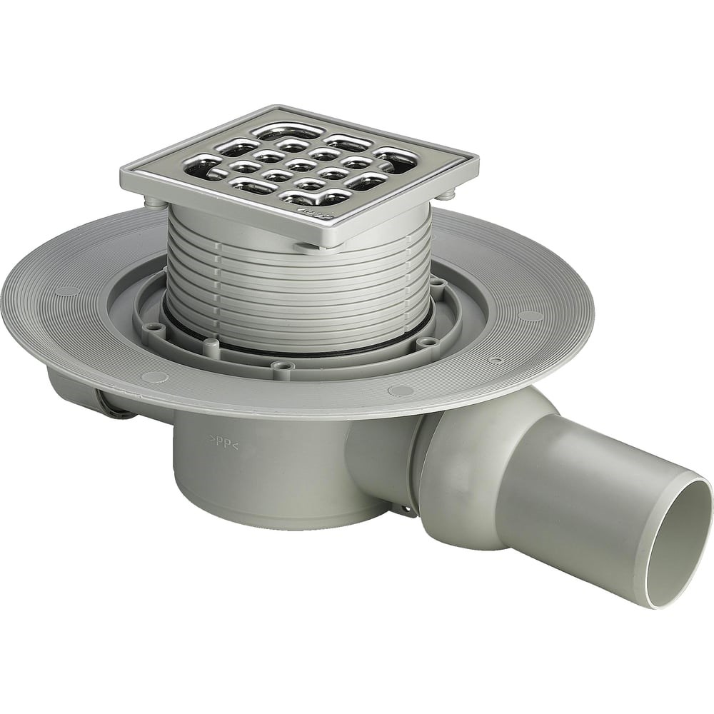 Длина внешней части: 100 мм. Ширина внешней части: 100 мм. Диаметр подключения: 50 мм. Максимальная пропускная способность: 36 л/мин. Предельно допустимая нагрузка: 300 кг. Квадратная решетка, цвета хром. Регулировка по высоте.