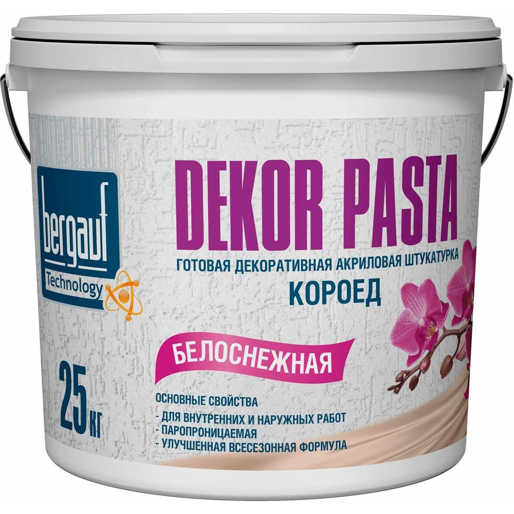 Готовая декоративная акриловая штукатурка Bergauf Dekor Pasta (короед; 2 мм; 25 кг) 52541. Белоснежная Для внутренних и наружных работ Паропроницаемая Улучшенная всесезонная формула Состав: Стирол-акриловая дисперсия, пигменты, наполнители, присадки, консервант.
