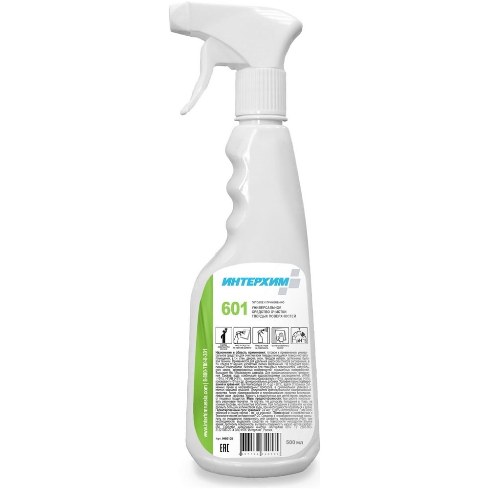 Готовое к применению универсальное средство очистки твердых поверхностей ИНТЕРХИМ 601 0.5 л ih60105 предназначено для уборки помещений, в т.ч. стен, дверей, окон, твердой мебели, оргтехники, бытовой техники. Отлично удаляет следы от чернил, косметики, липких загрязнений. Безопасно для глянцевых поверхностей, натурального камня, хромированных поверхностей, окрашенных поверхностей. Не оставляет разводов.