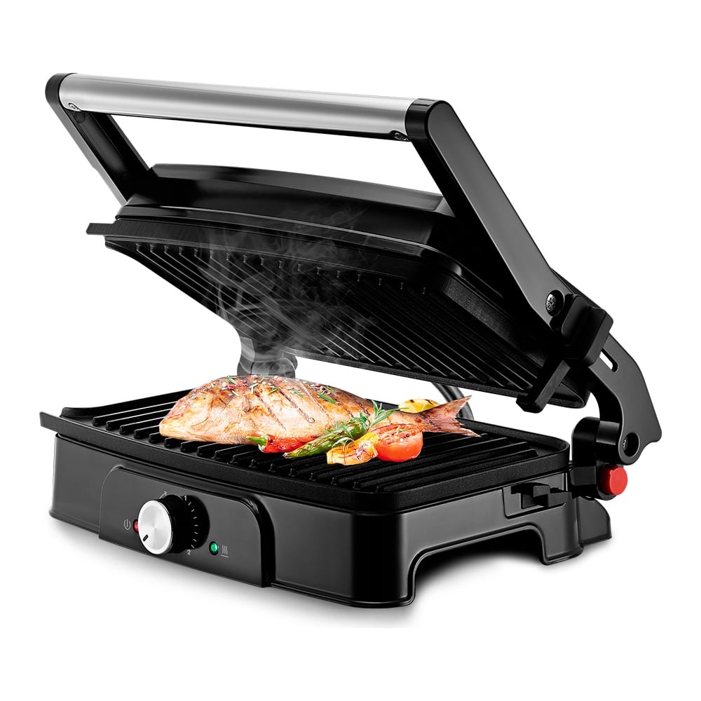 Электрогриль KITFORT КТ-1659 предназначен для приготовления мяса, рыбы, овощей, сосисок, бутербродов, сэндвичей, гренок, тостов! Высокая температура способствует быстрому приготовлению продуктов, а ребристая поверхность – появлению на них характерного «полосатого» рисунка. Верхняя нагреваемая панель может опускаться не до конца, что полезно при готовке продуктов, которые могут потерять форму из-за давления крышки. Также панель откидывается на 180°, и гриль превращается в жаровню, а продукты выкладываются сразу на 2 панели. С такой конструкцией нагрев и передача t на поверхность происходит эффективнее, и время прогрева и приготовления сокращается. Панели алюминиевые с антипригарным покрытием – идеально для приготовления продуктов с минимальным количеством масла. Электрогриль оснащён термостатом для поддержания постоянной температуры панелей и индикаторами, показывающими наличие питания, а также включение и отключение нагрева. Для сбора жира, сока и лишнего маринада предназначены специальные бороздки на нижней и верхней панелях гриля – во время приготовления жир скапливается в них, а затем стекает в ёмкости для жидкости. Раскладывающиеся ножки в нижней задней части гриля позволяют устанавливать гриль под небольшим наклоном. Это полезно при готовке в двустороннем режиме – из-за наклона жир и прочие жидкости легче стекают в ёмкость для жидкости.