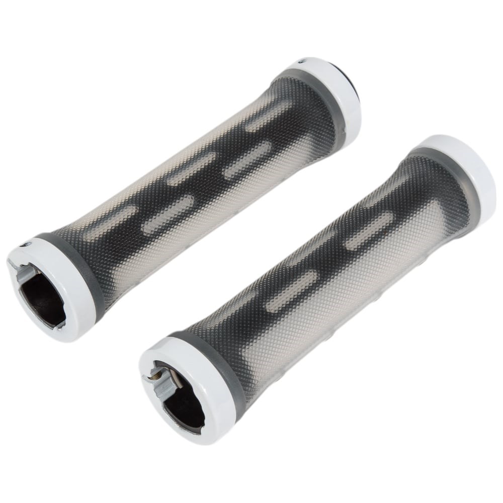 Грипсы JOY KIE MTB HL-G309, 130 мм, с 2 грипстопами, под шестигранник, черный/серебристый H000008039 препятствуют соскальзыванию рук, гасят вибрацию, не натирают ладони и делают поездку более комфортной. Обеспечивают отличный хват как в велоперчатках, так и без них. Одеваются на концы руля и меняются по мере изношенности.