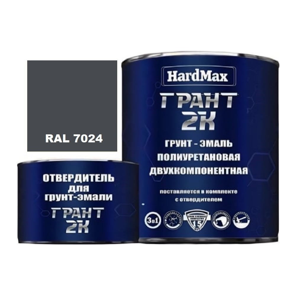 Грунт-эмаль HardMax ГРАНТ 2К RAL 7024 серый графит, комплект 2.19 кг 4690417100545 предназначена для окраски металлических и деревянных конструкций ответственного назначения, изделий из стеклопластика и чугуна, требующих сочетания высоких декоративных и эксплуатационных свойств, а также продолжительного срока службы покрытия в атмосферных условиях различных климатических зон и внутри помещений. Область применения: Металлические конструкции (мосты, эстакады, путепроводы, ангары, вышки сотовой связи, линии электропередач, станки, технологическое оборудование) Наружной и внутренней поверхности кабин, узлов и деталей оперения сельскохозяйственной, дорожной, коммунальной и строительной техники Ходовой части автомобильного транспорта (металлические поверхности топливных баков, детали и сборочные единицы платформ, детали шасси, радиаторы, рессоры, амортизаторы, карданные валы и мосты)