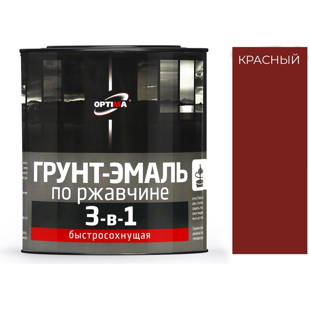 Грунт-эмаль OPTIMA 3 в 1 NEW быстросохнущая сочетает в себе свойства преобразователя ржавчины, грунтовки и эмали. Идеально подходит для защиты и окрашивания новых и старых стальных и чугунных конструкций, на которые оказывается воздействие атмосферных условий (УФ, дождь, снег, град). Грунт-эмалью OPTIMA красят заборы и ограды, лестничные перила, дачную садовую мебель скамейки, качели, столы и многое другое Расход 100-130 г/м.кв Матовая поверхность Срок годности 12 месяцев