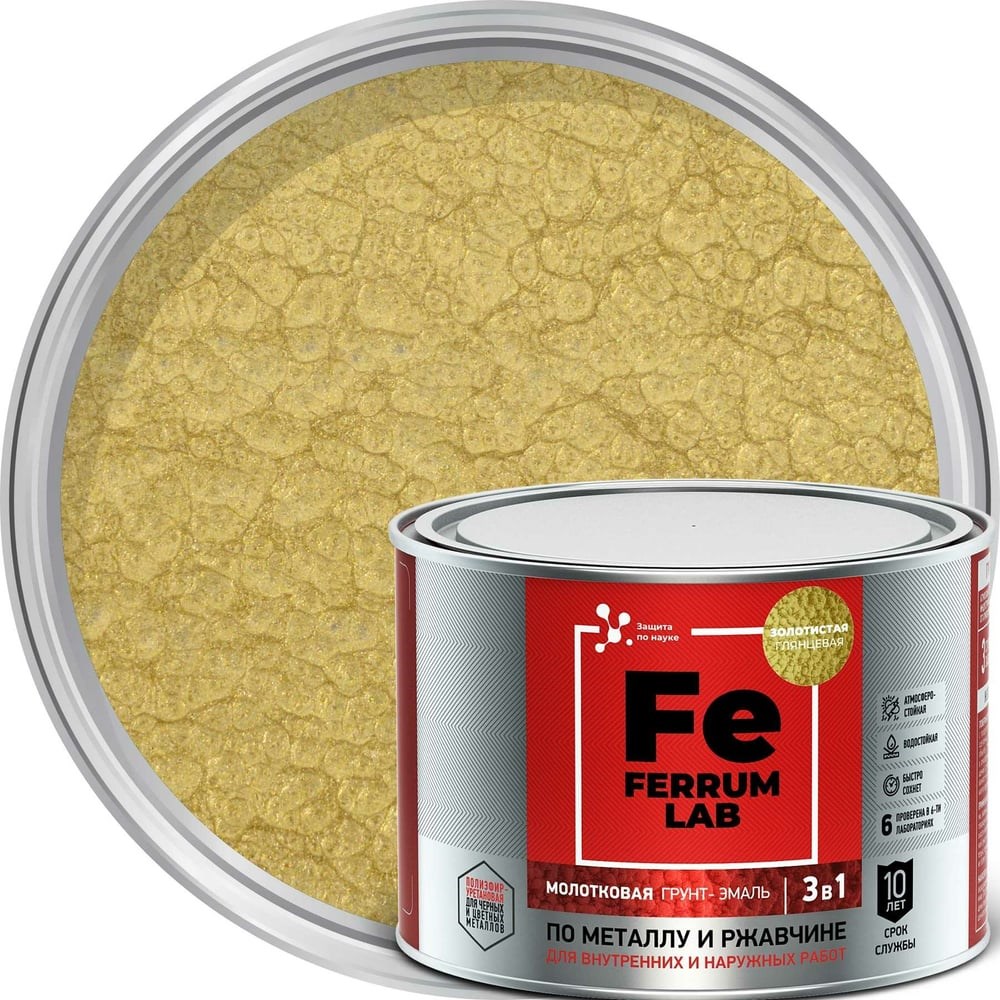 Грунт-эмаль FERRUM LAB по ржавчине 3 в 1 молотковая золотистая, банка 0,4 л 213550 с декоративный эффектом ручной чеканки применяется для создания износостойкого защитно-декоративного покрытия на чёрных и цветных металлах. Материал обладает повышенной стойкостью к механическим нагрузкам, действию солей, масел, бензинов, благодаря чему имеет широкий спектр применения в промышленности и в быту. Грунт-эмаль не требует предварительного грунтования, может наноситься на чистый и ржавый металл, в том числе с продуктами точечной, сплошной коррозии, с остатками старого покрытия, плотно сцепленных с основанием. Подходит для оцинкованного металла и алюминия после предварительной подготовки основания. Допускается окрашивание деревянных поверхностей.