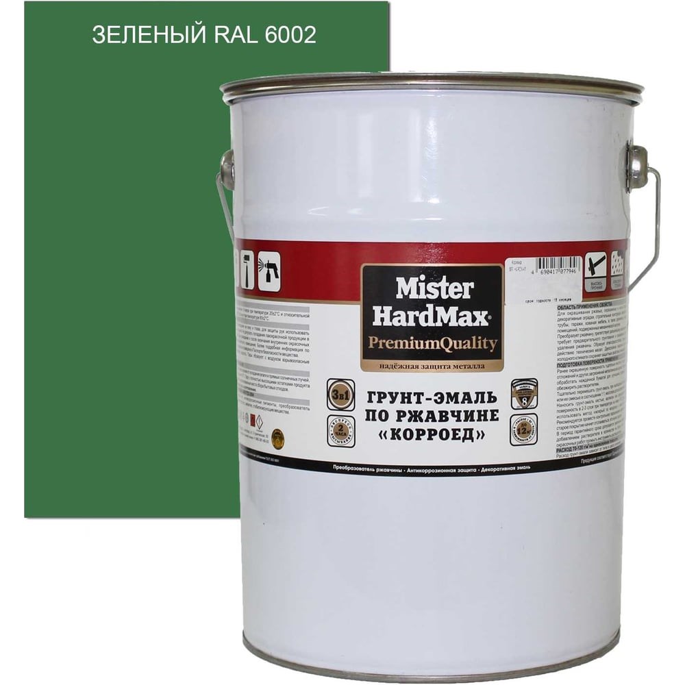 Грунт-эмаль по ржавчине HardMax КОРРОЕД MISTER (RAL 6002 зеленый; 21 кг) 4690417071456 предназначена для одновременного преобразования ржавчины, антикоррозионного грунтования и финишной окраски чистых и металлических поверхностей с толщиной прочно связанной с металлом ржавчины до 100мкм. Грунт-эмаль можно использовать в качестве антикоррозионной грунтовки под финишные атмосферостойкие эмали в многослойных системах покрытий. Грунт-эмаль представляет собой суспензию антикоррозионных пигментов и наполнителей в растворе модифицированного алкидного лака с добавлением органических растворителей и целевых добавок. Объекты Строительные конструкции, промышленное оборудование, складские помещения, ангары, гаражи, трубы, ворота, двери, навесы, кованая мебель, декоративные ограждения, решетки и другие изделия. Внимание! Расход материала может изменяться в зависимости от типа и степени подготовленности поверхности, выбранного инструмента, условий нанесения.