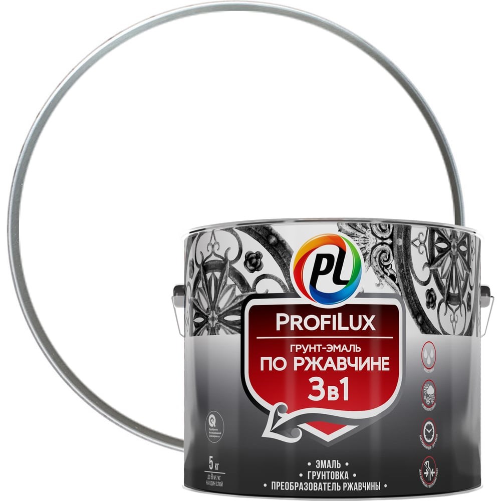 Грунт-эмаль Profilux по ржавчине 3в1 белая 5 кг Н0000004991 совмещает в себе функции преобразователя ржавчины, грунтовки и финишного покрытия. Подходит для обработки крупногабаритных конструкций, деталей машин, сельскохозяйственной техники, предметов сложной формы. Состав создает защитно-декоративное покрытие, которое не боится воздействия влаги, атмосферных явлений и моющих веществ. Продукт отличается высокой укрывной способностью и надежным сцеплением с обработанным основанием. Грунт-эмаль полностью готова к использованию.