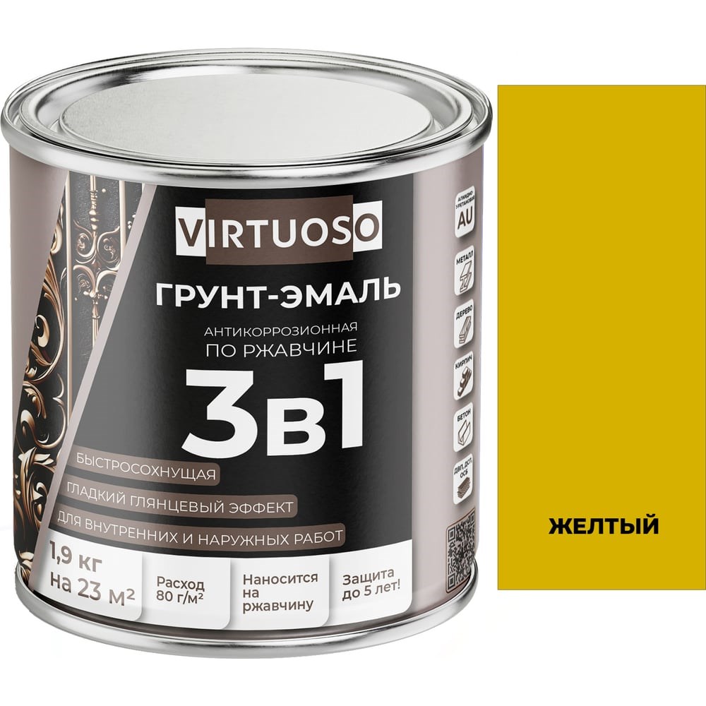 Грунт-эмаль VIRTUOSO PREMIUM 3 в 1 по ржавчине желтая 1,9кг 11592722 создает защитно-декоративное покрытие на поверхностях из металла. Состав подходит для оснований, которые испытывают на себе негативное воздействие влаги и различных атмосферных явлений. Обработанная поверхность получает обновленный внешний вид, а также приобретает высокую устойчивость к износу, коррозии и влиянию чистящих веществ.