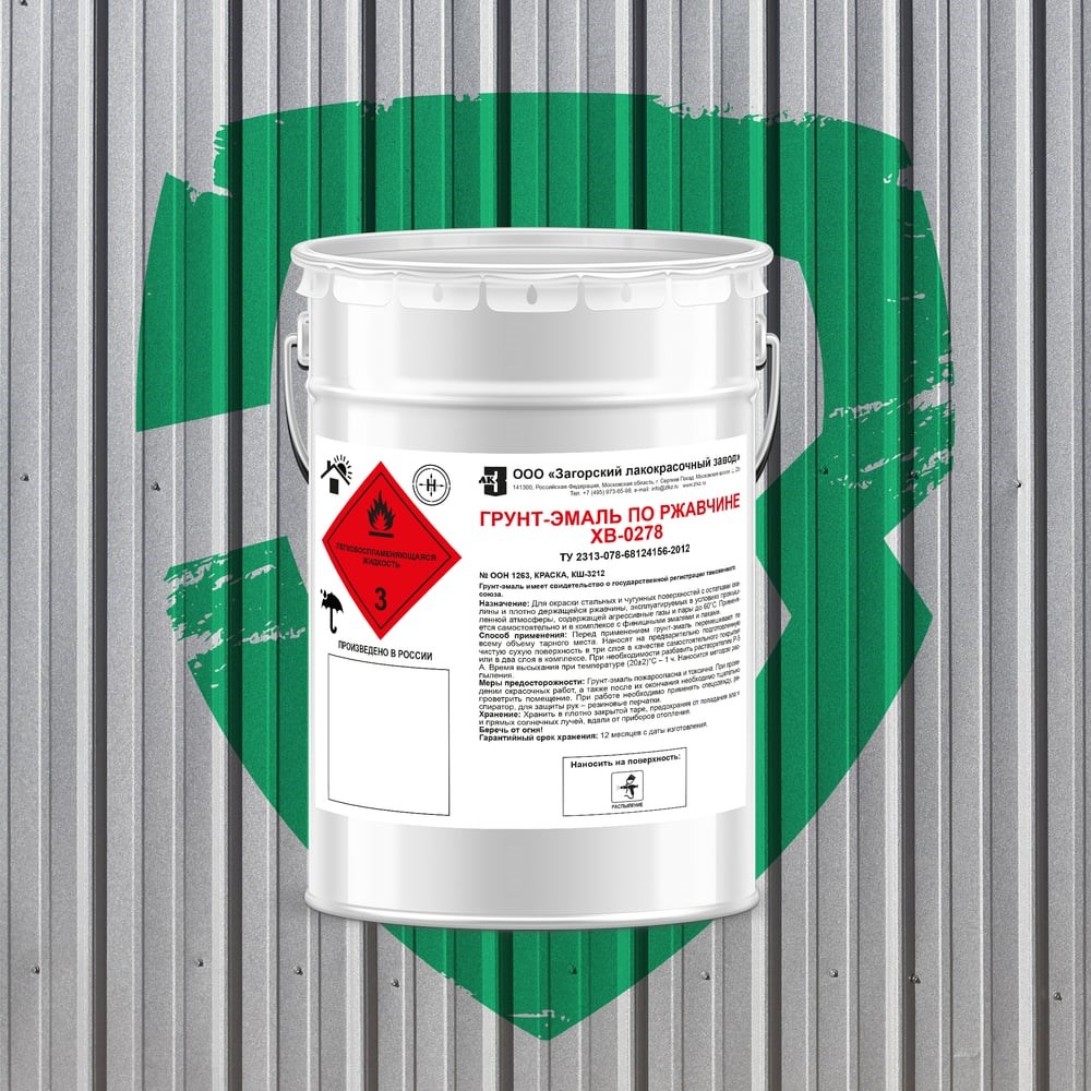 Грунт-эмаль по ржавчине ЗАГОРСКИЙ ЛАКОКРАСОЧНЫЙ ЗАВОД ХВ-0278 зеленая 10 кг ZLK05355 предназначена для защитно-декоративного окрашивания стальных и чугунных поверхностей с остатками окалины и ржавчины (толщина коррозии до 70 мкм). Состав используют при изготовлении новых и ремонте старых металлоконструкций в качестве самостоятельного покрытия или в комплексе с атмосферостойкими эмалями и лаками типа ХС, ХВ, НЦ, ПФ, ЭП. Продукт находит широкое применение в дорожном строительстве, военно-промышленном комплексе, при ремонте автотранспорта (обработка днища, крыльев, порогов и прочих деталей), при окраске гаражей, крыш, кованных декоративных решеток. Финишный слой обладает высокой устойчивостью к воздействию солей и химических реагентов, имеющих температуру не выше +60°C, и промышленной атмосфере с содержанием агрессивных газов и паров. Грунт-эмаль совмещает в себе три свойства: Преобразователь ржавчины - останавливает дальнейшее развитие коррозии. Грунтовка - обеспечивает адгезионные и антикоррозионные свойства поверхности. Эмаль - образует гладкое, матовое покрытие, устойчивое к воздействию воды, солей, повышенной влажности.