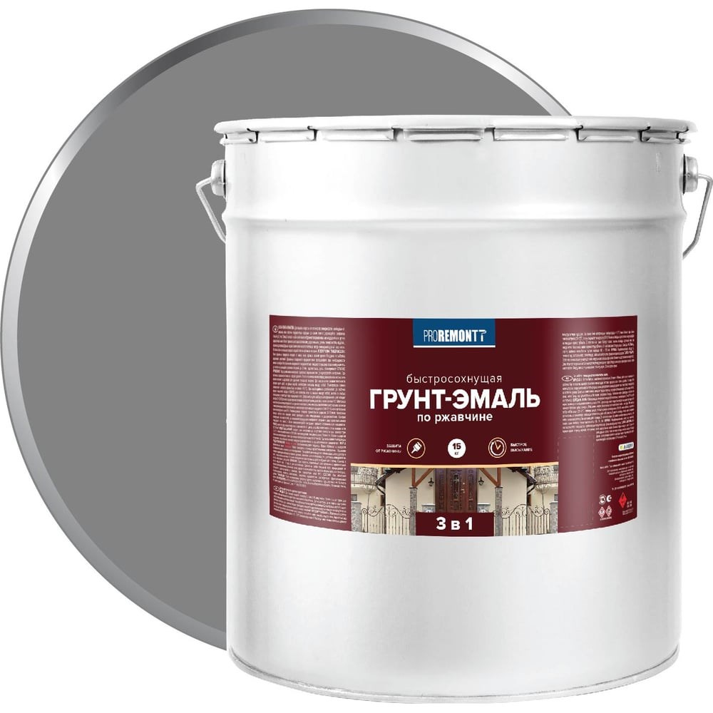 Грунт-эмаль Proremontt 3 в 1 серая, 15 кг Лк-00012393 на алкидно-уретановой основе совмещает функции 3 продуктов: преобразователь ржавчины, антикоррозионный грунт и износостойкий финишный слой. Состав применяют для внутренних и наружных работ. Служит для окраски металлических поверхностей: забор, ворота, решетки и т.п. Расход эмали на однослойное покрытие в зависимости от цвета, способа нанесения и типа поверхности от 90 до 200 г/кв. м.