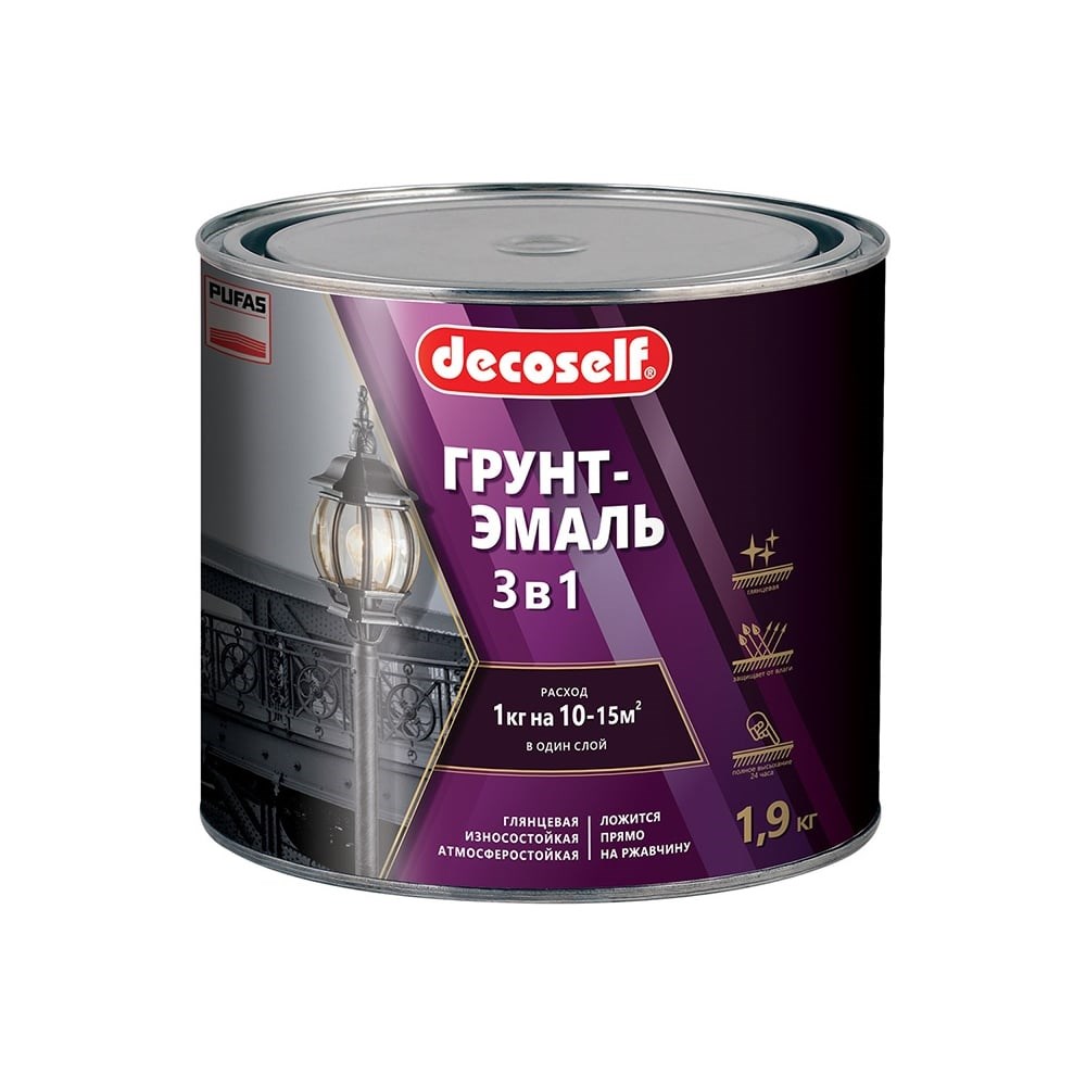 Грунт-эмаль Pufas Decoself 3 в 1 красная, глянцевая, 1.9 кг тов-200089 применяется для окрашивания изделий из металла с толщиной ржавчины до 0.1 мм. Подходит для нанесения на гаражи, автомобили и металлические конструкции. Обладает антикоррозийными свойствами, атмосферостойкостью и влагостойкостью. Быстро высыхает. Покрытие полностью высыхает за 24 часа.