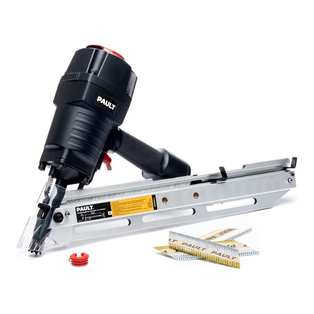 Пневматический гвоздезабивной пистолет PAULT CHF9034C предназначен для сборки каркасных деревянных домов, обрешетки, стропильных систем и sip-панелей. Используемый крепеж - реечные гвозди 34° в бумажной кассете: угол наклона 34 градуса, шляпка гвоздя D - образная; длина от 50 до 90 мм; диаметр гвоздей 2,8-3,1 мм; гладкие, ершеные (кольцевая накатка), винтовые; Область применения: сборка каркасных домов, бань и беседок; монтаж кровли, стропил, настила; изготовления поддонов и деревянных ящиков; общие строительные работы, включая наружную обшивку, отделку, обшивку панелями, монтаж деревянного забора; Особенности инструмента: Регулировка глубины забивания гвоздя; Рабочее давление 5,5 -8,0 Бар, расход воздуха 2,5 литра на выстрел; Наклон магазина 34 градуса позволяет работать в труднодоступных местах, когда приходится стрелять под углом; Емкость магазина 60 гвоздей; Хорошо сбалансированный и удобный при работе, вес 4,1 кг; Эргономичная прорезиненная ручка; Калёный прочный боёк повышенной износостойкости; Дефлектор для выброса отработанного воздуха вращается на 360°, что позволяет оператору выбрать направление выброса отработанного воздуха; Наличие предохранительной скобы для безопасной работы и защиты от случайного выстрела; Монтажный пистолет поставляется в удобном кейсе;