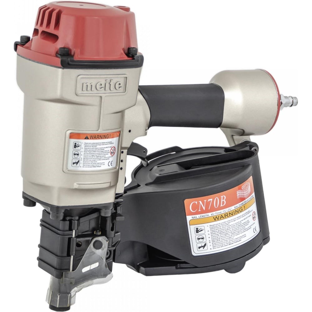 Гвоздезабивной пневмоинструмент MEITE CN70B GBA42B00303 – промышленная модель инструмента для забивания барабанных гвоздей (в диапазоне от 45 мм до 70 мм). Используемые барабанные гвозди на проволочной сцепке – гладкие, а также с винтовой и кольцевой насечкой. Применяется в первую очередь при производстве паллет (поддонов), а также при изготовлении и ремонте других изделий из дерева, таких как тара, ящики и упаковка. Работают с инструментом в специально организованных местах как внутри помещений, так и на открытом воздухе с переменной влажностью и минусовой температурой. Высокая скорость (3 выстрела в секунду) позволяет увеличить производительность в сравнении с ручным трудом в 4 раза. Инструмент надежен и прост в эксплуатации, работа с ним не требует специальных знаний и навыков. Дополнительную безопасность труда обеспечивает наличие предохранителя от "случайного" выстрела. Особенность модели: дефлектор по отводу отработанного воздуха вперед.