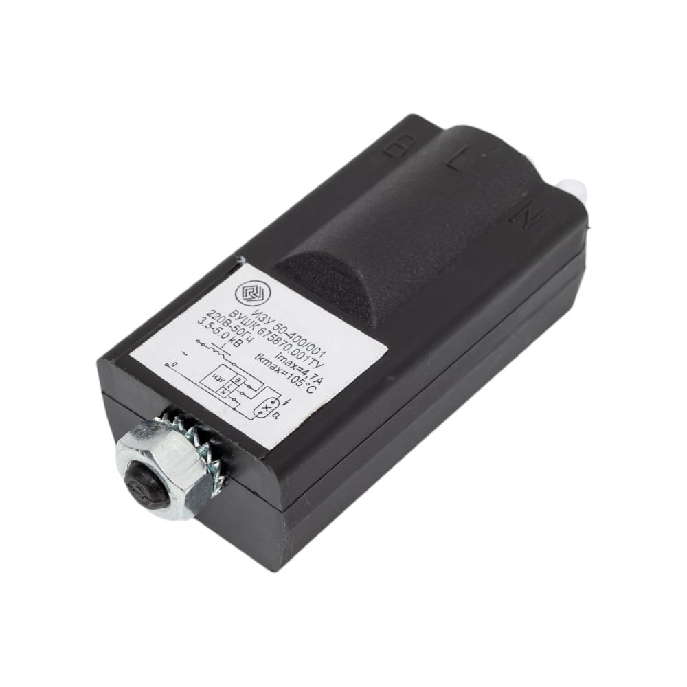 Устройство зажигающее импульсное типа ИЗУ предназначено для зажигания разрядных ламп высокого давления типов ДНаТ и ДРИ мощностью 35, 50, 70, 100, 150, 250, 400 Вт совместно с соответствующим индуктивным пускорегулирующим аппаратом (ПРА) при включении их в сеть переменного тока частотой 50 Гц и номинальным напряжением 220 В. Рабочий ток, максимальное значение: 4,7А. Диапазон рабочих температур: при токе 4,7А: -60 - +60 град.С; при токе менее 3А: -60 - +70 град.С. Максимальная температура корпуса: 105 град.С. Амплитуда зажигающего импульса: 3,5-5 кВ.
