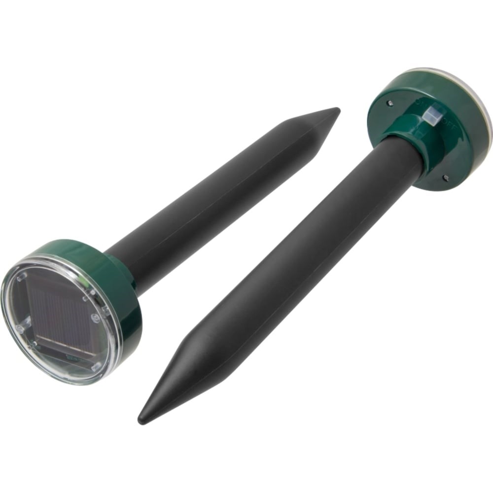 Ультразвуковой импульсный отпугиватель MPF на солнечной батарее, от кротов и змей, 2 шт., 26 см ДС.070928 предназначен для безопасной и эффективной защиты садового участка от подземных грызунов и змей с помощью вибрации и ультразвуковых колебаний. Площадь воздействия достигает 650 кв.м. Для достижения наилучшего результата необходимо размещать отпугиватели на садовых участках через каждые 30 м и непрерывно использовать в течение 7–14 дней. Солнечная батарея способна сохранять достаточно энергии для питания устройства в течение нескольких дней. Установка: Выберите место без тени и укрытия, вставьте стойку (стержень) в землю, убедитесь, что верхняя часть находится выше уровня поверхности примерно на 2-5 см. Нажмите переключатель «ВКЛ/ВЫКЛ». Отпугиватель начнет вибрировать и издавать звуки каждые 20 секунд. Дополнительные характеристики: Источник питания: перезаряжаемые аккумуляторные 1200 мАч Ni-MH батареи; Частота отпугивателя: 400 Гц – 1000 Гц; Интервал: 20 с; Класс влагозащиты защиты: IP 44.