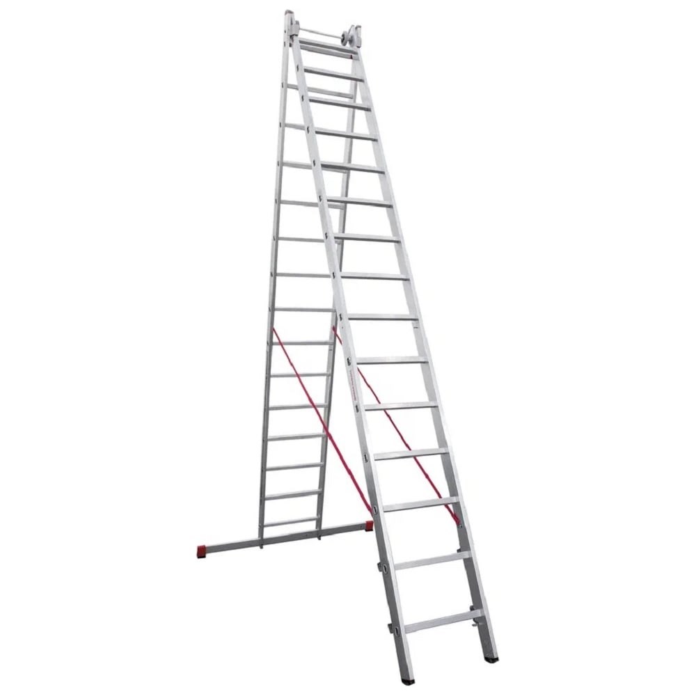 Алюминиевая двухсекционная индустриальная лестница Новая Высота 2х20 5220220 может использоваться в качестве приставной лестницы, приставной выдвижной лестницы и стремянки. Имеет надежную и прочную алюминиевую конструкцию, которая способна выдержать нагрузку до 150 кг. Верхняя секция оборудована колёсами для удобства раздвижения по стене. Все зацепы имеют автоматический фиксатор, что облегчает эксплуатацию лестницы. На траверсе и стойках расположены опорные наконечники из пластика, которые препятствуют скольжению. Ступени с рифлёной поверхностью обеспечивают безопасный подъем и спуск. Внимание! Количество ступеней отличается от представленного на фото.
