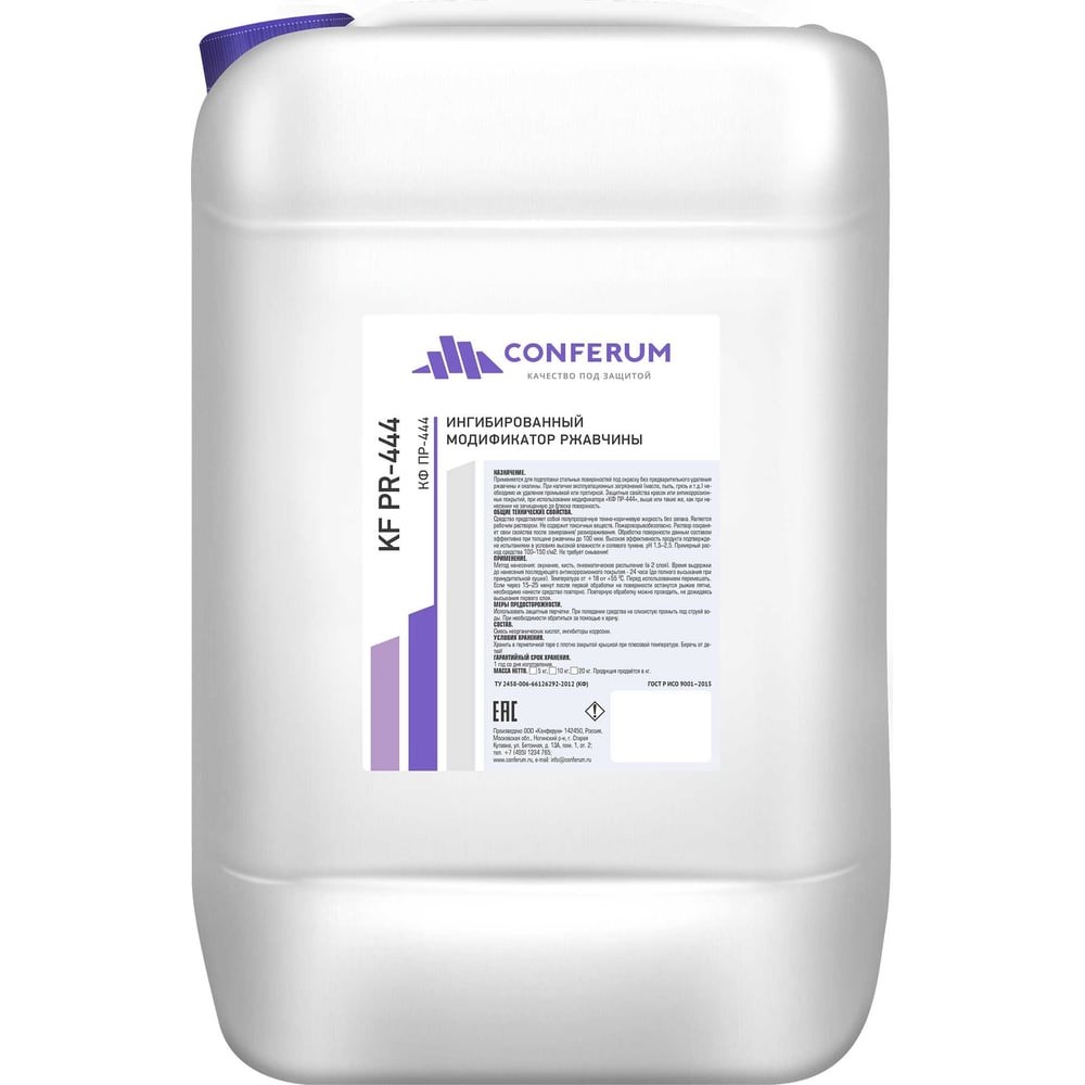Ингибированный преобразователь ржавчины КОНФЕРУМ КФ ПР 444 2799/1 применяется для подготовки стальных поверхностей под окраску без предвари-тельного удаления ржавчины и окалины, но при наличии эксплуатационных загрязнений (масло, пыль, грязь) необходимо их удаление промывкой или протиркой. Защитные свойства красок или антикоррозионных покрытий, при использовании модификатора КФ ПР 444, выше или такие же, как при нанесении на зачищенную до блеска поверхность. Общие технические свойства: Средство представляет собой полупрозрачную темно-коричневую жидкость без запаха. Является рабочим раствором. Не содержит токсичных веществ, безопасно для обслуживающего персонала. Пожаровзрывобезопасно. Раствор сохраняет свои свойства после замерзания. Обработка поверхности данным составом эффективна при толщине ржавчины до 100 мкм. Высокая эффективность продукта подтверждена испытаниями в условиях высокой влажности и солевого тумана. Способ применения: Метод нанесения - окунание, кисть, пневматическое распыление (в 2 слоя). Время выдержки до окрашивания или до нанесения последующего антикоррозионного покрытия - 24 часа (до полного высыхания при применении принудительной сушки). Температура - 18-55°С. Расход - 100-150 г/м2. Перед использованием перемешать. Если через 15-25 минут после первой обработки на поверхности останутся рыжие пятна, необходимо нанести преобразователь повторно. Повторную обработку можно проводить, не дожидаясь высыхания первого слоя. Не требует смывания.
