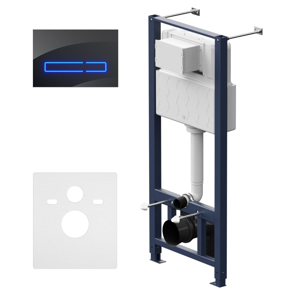 Максимально полная комплектация - все необходимые крепления, патрубки, звукоизолирующая прокладка в комплекте. Вертикальные ребра жесткости в конструкции рамы – дополнительная опора в месте давления керамики на стену. Благодаря им инсталляция более универсальная и подходит для унитазов любых размеров, включая унитазы с небольшой контакnной поверхностью. Нет необходимости докупать дополнительные аксессуары для монтажа таких унитазов. Рама выдерживает нагрузку до 500 кг. Внутреннее сечение профиля 3 мм обеспечивает надежность и долговечность конструкции. Цельный бесшовный бачок из полиэтилена с защитой от конденсации. Комфортное использование благодаря заливному клапану с низким уровнем шума - менее 20 Дб.В комплекте сенсорная бесконтактная клавиша, материал стекло, цвет черный глянец. Гигиеничный бесконтактный смыв - достаточно поднести руку на расстояние 2-3 см от сенсора для активации смыва.Стильный дизайн – внешняя панель выполнена из чёрного стекла, при активации смыва включается подсветка. Простота монтажа – не требуется подводить электричество, клавиша работает от батареек. Экономичность - качественные батарейки прослужат до одного года в условиях домашнего использования. Комфорт – если батарейки разряжены, смыв можно активировать вручную, сняв внешнюю стеклянную панель.