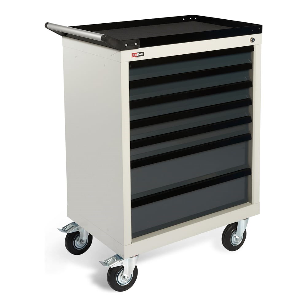 Инструментальная тележка ДиКом TS-950.07 с 7 ящиками создана специально для автосервисов. Пять малых и два больших сварных ящика закрываются на общий центральный замок EURO-LOCKS (Германия, 10 000 комбинаций). Внутренний размер ящика: 570х400х55/130 мм. Максимальная нагрузка на ящик — 50 кг, на тележку — 300 кг. Тумба-тележка оборудована поворотными колесами диаметром 125 мм, два колеса с тормозом. Сверху установлен металлический лоток с алюминиевой ручкой. Лоток укомплектован ковриком из противоскользящей резины.  Гарантия на тележку — 3 года.