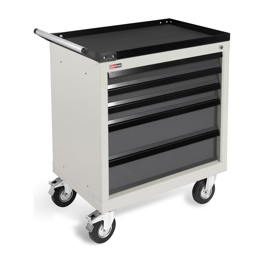 Инструментальная тележка ДиКом TS-800.05 с 5 ящиками создана специально для автосервисов. Три малых и два больших сварных ящика закрываются на общий центральный замок EURO-LOCKS (Германия, 10 000 комбинаций). Внутренний размер ящика: 570х400х55/130 мм. Максимальная нагрузка на ящик — 50 кг, на тележку — 300 кг. Тумба-тележка оборудована поворотными колесами диаметром 125 мм, два колеса с тормозом. Сверху установлен металлический лоток с алюминиевой ручкой. Лоток укомплектован ковриком из противоскользящей резины. Гарантия на тележку — 3 года.