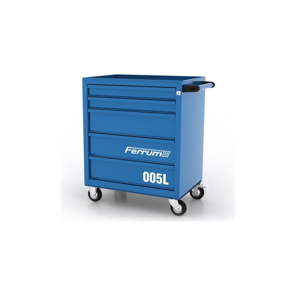 Инструментальная тележка FERRUM с 5 ящиками 02.005L-5015 предназначена для хранения и транспортировки различных инструментов, крепежа и аксессуаров.Ящик 565х417х45 h мм - 2 штЯщик 565х417х125 h мм - 3 штТип направляющих - телескопические, развернутый подшипникТип крепления- зацепВыдвижение ящика - 92 %Замок - центральный с блокировкой всех ящиковКоличество ключей - 2 штДиаметр колес - 100 ммКомплект колес - 2 неповоротных, 1 поворотное, 1 поворотное со стопоромПокрытие колеса - бензомаслостойкая резинаПокрытие рабочей поверхности тележки- бензомаслостойкий коврик толщиной 4 ммВозможность крепление аксессуаров на боковых стенках тележкиТип покрытия - порошковое эпоксидно-полиэфирное
