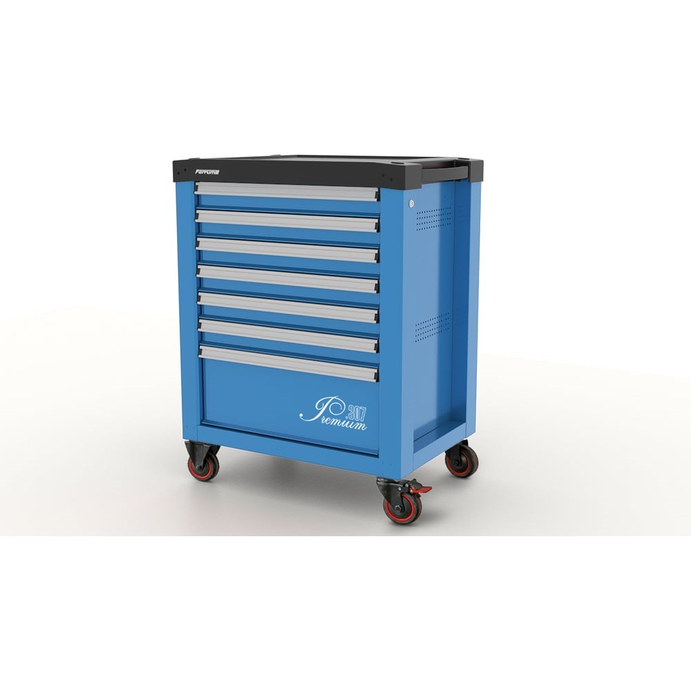 Инструментальная тележка Ferrum "Premium" с 7 ящиками 12.307-5015/5015 для хранения ручного инструмента и оборудования. Тележка оборудована механизмом антиопрокидывания, совмещенным с центральной системой запирания, блокирующем открытие любого выдвижного ящика при уже открытом одном выдвижном ящике, с целью предотвращения самопроизвольного опрокидывания тележки. Количество ключей - 2 шт. Рабочая поверхность тележки установлена крышка из ударопрочного пластика с боковым держателем инструмента и бортиками, исключающим падение инструмента. Боковые поверхности тележек имеют по 2 поля перфорации с каждой стороны. Равнораспределенная нагрузка на корпус тележки -270 кг. Эргономичные ручки ящиков из анодированного профиля с возможностью установки информационной вставки и защитной пленки. Торцы ручек закрыты пластиковыми заглушками. Выдвижение ящиков -92%. Внутренние размеры ящиков: 568х416х66 мм - 6 шт. 568х416х227 мм - 1 шт. Равнораспределенная нагрузка на ящик - 50 кг. Колеса покрыты термопластичной резиной. Стопор с двумя педалями. Фиксация осуществляется в двух направлениях (качения и вращения). Диаметр колес 100 мм.