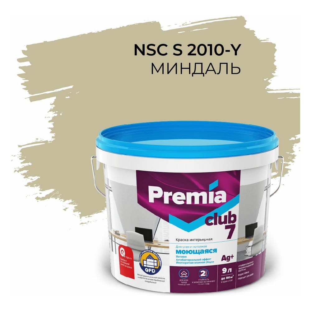 Интерьерная колерованная краска PREMIA CLUB 7 для стен и потолков, моющаяся, миндаль S 2010-Y, ведро 9 л О05711 идеально подойдет для создания дизайна и уюта помещений с высокой эксплуатационной нагрузкой. После высыхания образует гладкое матовое покрытие, которое скроет мелкие дефекты, надёжно защитит поверхность от влаги и плесени и придаст помещению современный эстетичный вид. PREMIA CLUB 7- лучший выбор для окраски ванных комнат, кухонь, коридоров, парадных и других помещений, где необходима регулярная влажная уборка. Покрытие выдерживает более 50 000 проходов щеткой. Рекомендуется для окраски детских, спортивных и лечебных учреждений. Подходит для окраски путей эвакуации (класс пожароопасности - КМ 1).
