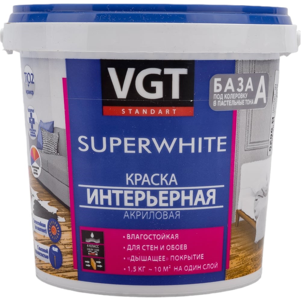 Краска VGT Супербелая ВД АК 2180 интерьерная, влагостойкая 1,5кг 11605421 применяется для окраски стен и потолков в помещениях с нормальной влажностью. Возможно использование для окрашивания различных типов обоев. Отличается хорошей адгезией к бетонным, кирпичным, гипсокартонным и оштукатуренным поверхностям. После высыхания образует ся ровная матовая поверхность. Особенности: Устойчивость к незначительным механическим воздействиям Светостойкость (не желтеет в процессе эксплуатации) Хорошая укрывистость
