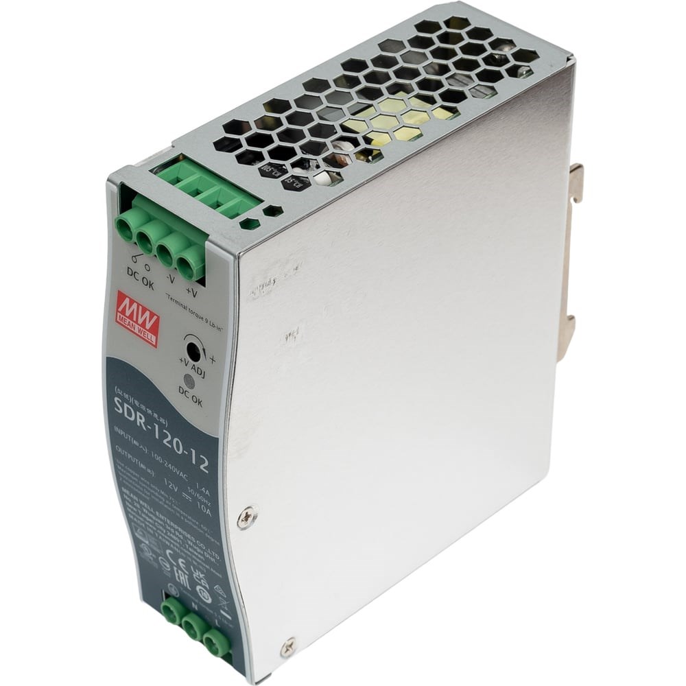 AC-DC сетевой преобразователь серии SDR-120 для монтажа на DIN рейку. ККМ;120 Вт; 12 В.ОсобенностиВыдерживает перегрузки до 150%;Встроенный активный ККМ;Защита от короткого замыкания, перегрузки, перенапряжения на выходеи перегрева;Естественное охлаждение;Узкий корпус;Установка на DIN рейку;Релейные контакты DC OKВыходная мощность: 120 Вт;Напряжение: 12 В;Выходной ток: до 10 А;Входное напряжение: 88...264 В AC/ 124...370 В DC;Коэффициент мощности: >0.93;Напряжение изоляции вход-выход: 3 кВ;Напряжение изоляции вход-земля: 1.5 кВ;Напряжение изоляции выход-земля: 500 В;КПД: 89 %;Шумыи пульсации: 100 мВ;Рабочая температура: -25...70 °C;Температура хранения: -40...85 °C;Размеры: 40х125.2х113.5 мм
