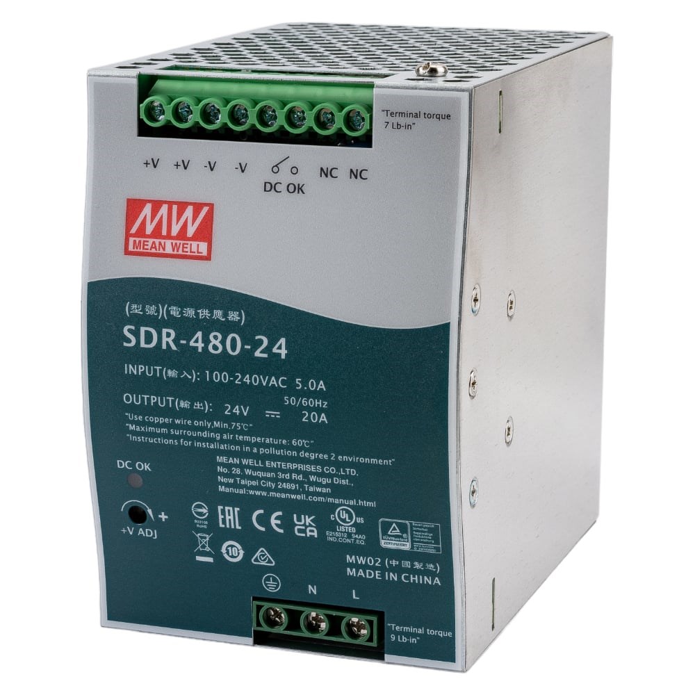 AC-DC, 480Вт, вход 90…264V AC, 47…63Гц /127…370В DC, выход 24В/20A, рег. вых 24...28В, изоляция 3000В AC, в кожухе на DIN-рейку 85,5х125,2х128,5мм, -25…+70°СПромышленный блок питания на DIN-рейке мощностью 480 Вт с одним выходом и функцией коррекции коэффициента мощностиОсобенностиВысокий КПД и низкое рассеивание мощности150% пиковая грузоподъемностьВстроенная функция активного PFC, PF более 0,94Защиты: Короткое замыкание / Перегрузка / Перенапряжение / ПерегревОхлаждение путем свободной конвекции воздухаВстроенная схема ограничения постоянного токаВозможность установки на DIN-рейку TS-35/7.5 или 15Одобрено UL 508 (промышленное контрольное оборудование)Уровень промышленной помехоустойчивости EN61000-6-2(EN50082-2)Встроенный релейный контакт DC OKИспытан на отказ при 100% полной нагрузке3 года гарантии
