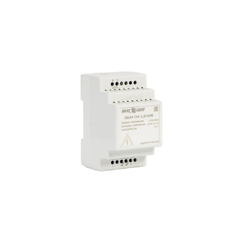Источник питания SKAT-24-1.0 DIN 24В 1,3А АКБ внешие 2х4,5-12Ач ток заряда 1,0–Iнагр. 598 предназначен для электропитания радиоэлектронной аппаратуры номинальным напряжением 24 В и обеспечивает (при наличии внешней АКБ) бесперебойное питание систем охранно-пожарной сигнализации, устройств автоматики, домофонов, электрических кодовых замков, телекоммуникационного оборудования и др. SKAT-24-1.0 представляет собой стабилизированный источник питания, который формирует выходное напряжение для питания нагрузки и осуществляет заряд внешней АКБ (при наличии). При отключении напряжения питающей сети происходит автоматический переход на резервное питание от АКБ (при наличии). При этом светодиодный индикатор «ВЫХОД» светится красным цветом, указывая на наличие выходного напряжения. Конструктивно изделие представляет собой печатную плату, расположенную в пластиковом корпусе, предназначенном для установки на 35 мм DIN-рейку.