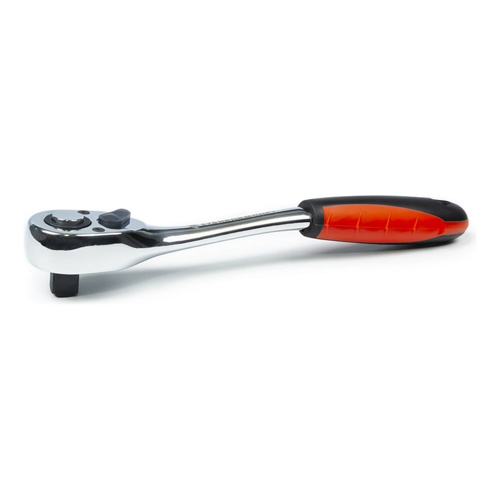 Изогнутая трещотка предназначена для использования с торцевыми головками, головками со вставками, битами (через адаптер). Трещотка с храповым механизмом значительно облегчает монтаж резьбовых соединений в ограниченном пространстве, где угол поворота ключа ограничен. Повышает производительность труда, исключая необходимость снимать и надевать торцевую головку на крепеж после каждого поворота, как в случае с обычным воротком. Применяется при обслуживании автомобилей и другой техники в домашних и автослесарных мастерских, на производствах или СТО. Трещотка изготовлена из высококачественной легированной хромованадиевой инструментальной стали, с последующей закалкой до твердости в пределах 46-48HRC, что обеспечивает оптимальное соотношение прочности и твердости. Изогнутый профиль рукояти в сочетании с 72-зубым механизмом существенно облегчает работу в условиях ограниченного пространства. Эргономичная рукоять обеспечивает надежное удержание инструмента и комфортную работу, а благодаря высококачественным компонентам рукоять обладает высокой стойкостью к агрессивным средам. Защиту от коррозии обеспечивает специальное хромоникелевое покрытие.