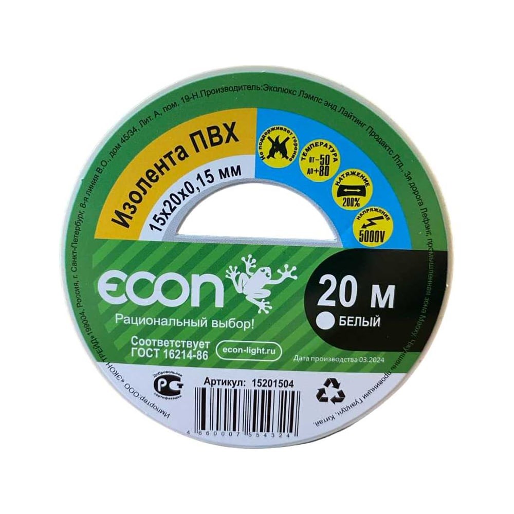 Изолента Econ 15 мм х 20 м, 0,15 мм, белый 15201504 обладает следующими свойствами: изготовлена из ПВХ высокого качества; диапазон рабочих температур от -50 до +80 °С; адгезия (липкость) 45 секунд; обладает отличными клеящими свойствами; относительное удлинение при разрыве не менее 200%; не поддерживает горение. соответсвует ГОСТ 16214-86.