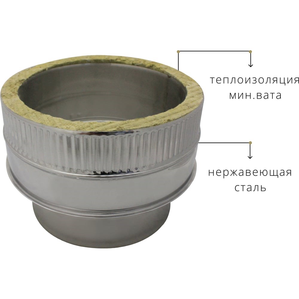 Изолированный адаптер РОССТИН D150 мм /150-200 мм., 304-0,5/430-0,5 аи-150/200-3040543005 предназначен для подключения одноконтурной части системы дымоудаления к теплоизолированной. Вутренний диаметр - 150 мм. Внешний диаметр - 200 мм Цвет - хром. Марка стали: AISI 304/AISI 430