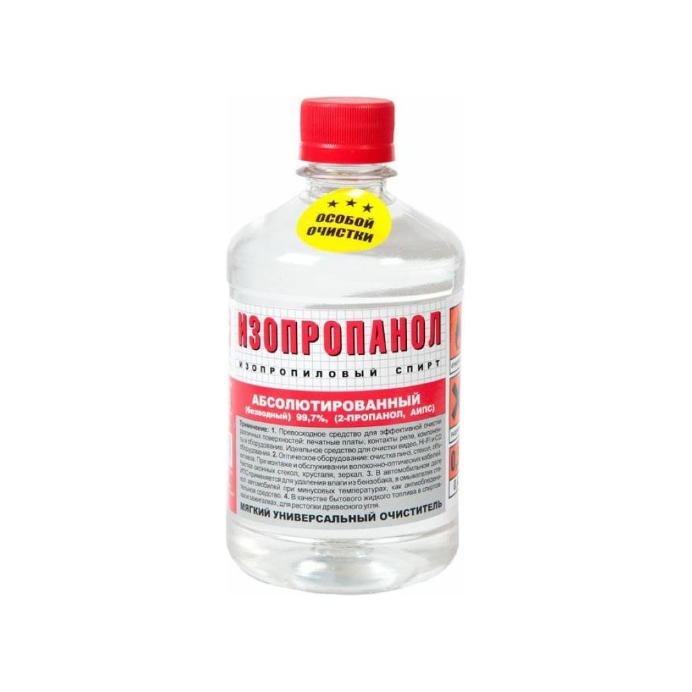 Изопропиловый cпирт ZeepDeep объем 500 мл 602149 позволяет осуществить мягкую очистку любого электронного, механического и оптического оборудования. Удаляет жир и масло так же хорошо, как и водорастворимую грязь без воздействия на материалы. Быстро испаряется не оставляя пятен на металлических или стеклянных поверхностях. Область применения: Эффективная очистка различных поверхностей: печатные платы, контакты реле, компоненты и оборудование. Идеальное средство для очистки видео, Hi-Fi и CD оборудования Оптическое оборудование: очистка линз, стекол, объективов. При монтаже и обслуживании волоконно-оптических кабелей (ВОЛС). Чистки оконных стекол, хрусталя, зеркал (при разбавлении водой до 1:5) В автомобильном деле спирт изопропиловый применяется для удаления влаги из бензобака, в омывателях стекол автомобилей при минусовых температурах (при разбавлении водой до 1:3), как антиобледенительное средство, октаноповышающая добавка В качестве бытового жидкого топлива в спиртовках и зажигалках, для растопки древесного угля Для полиграфии, фармацевтики, косметологии и для других бытовых нужд