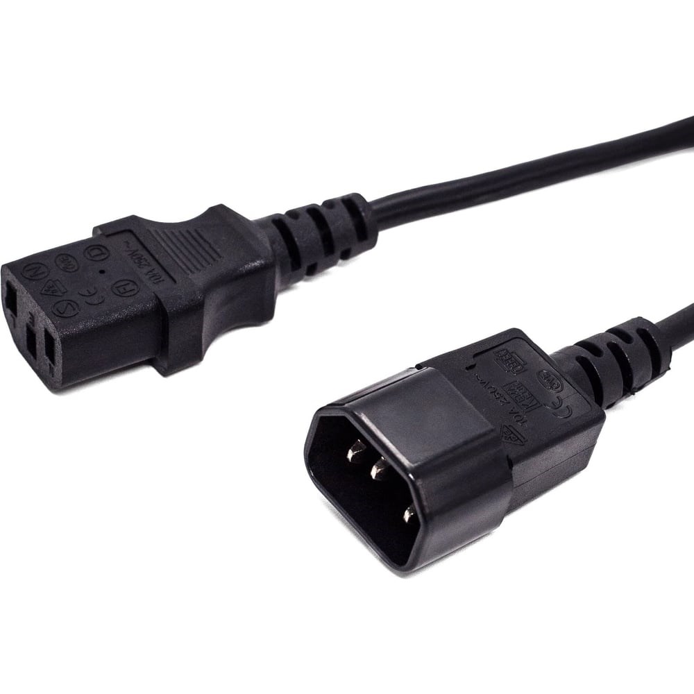 Кабель питания лужит для подключения ИБП, системных блоков, мониторов, в качестве удлинителя другого кабеля с разъемомC13. Суммарная номинальная мощность нагрузки 2200 Вт., номинальный ток нагрузки 10 А., разъемы C13 – C14, длина кабеля 1.8 м.