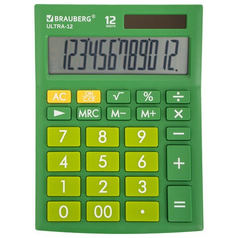 Калькулятор настольный BRAUBERG ULTRA-12-GN (192x143 мм), 12 разрядов, двойное питание, ЗЕЛЕНЫЙ, 250493