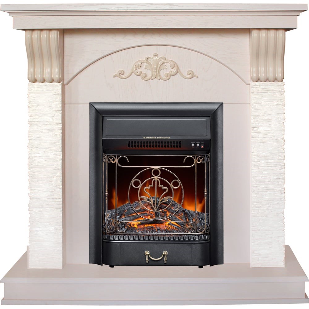 Каминокомплект RealFlame CORFINO STD WT MAJESTIC LUX - станет гармоничным продолжением классического интерьера. Нежный кремовый цвет, древесная фактура и стенки из рельефного скалистого камня делают этот камин воздушным и невесомым. Над очагом изящный растительный декор под арочным сводом. Сочетание природных фактур и красочного пламени очага позволят создать даже в городской квартире атмосферную каминную зону, располагающую к приятному общению и расслаблению.Электроочаг Majestic BL выполнен в стиле классической дровяной топки. Он подходит как для самостоятельного встраивания в стенную нишу так и для установки в каминный портал. Муляж дров выполнен в виде точной копии тлеющих углей и небольших поленьев. Благодаря задней зеркальной стенке проекция пламени смотрится более выразительно и эффектно. Изюминкой очага является ажурная кованая решетка. Она придает ему вид изысканной старины и делает камин центром любого интерьера.Очаг с функцией обогрева. 2 уровня регулировки обогрева. Мощность обогрева: 0,75/1,5 кВтГабариты очага: 610х503х245 ммВстраиваемые габариты очага: 555х405х140 ммУстановка в портал: снаружиСветодиодные лампы