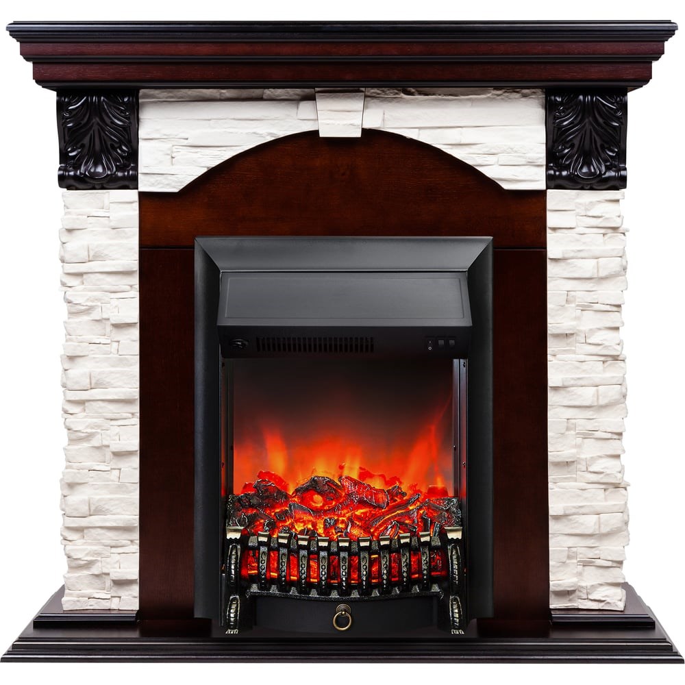 Каминокомплект RealFlame DUBLIN LUX STD/EUG AO FOBOS BL 10016128 выполнен в классическом стиле с античными элементами. Боковые колонны из светлого камня, стилизованного под натуральную сланцевую породу, дополнены резными узорами контрастного цвета. Столешница и постамент выполнены из дерева. Такое сочетание материалов подчеркивает изысканность портала и делает его выгодным приобретением для практических любых интерьеров.Оригинальность дизайна очага Fobos BL достигается литой чугунной решеткой, имитирующей колосник и внешней рамкой с небольшим капором. Благодаря задней зеркальной стенке создается эффект объемного пламени и дополнительной игры света и тени. Звук потрескивающих дров и наличие обогрева усиливает сходство с настоящим очагом.Очаг с функцией обогрева. Мощность обогрева: 0,75/1,5 кВЗащита от перегрева Регулировка яркости пламени Звуковой эффектГабариты: 610х503х290 мм Встраиваемые: 555х405х140 мм Установка в портал: снаружи Муляж: дрова Тип ламп: диодный Внутренняя стенка: зеркальная Корпус: черный Особенности: без внешнего стекла, литая чугунная решетка