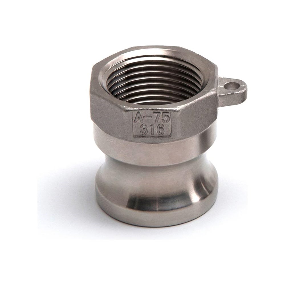 А: тип камлока - соединительный штуцер с внутренней резьбой и ответной частью "папа" 75: условное обозначение диаметра камлока 3/4": внутренний диаметр трубы (условный проход трубы), обозначение размера резьбы в дюймах. Соответствует 20 мм. Вид резьбы: дюймовая трубная цилиндрическая G (BSPP) Материал корпуса: нержавеющая сталь AISI 316 - это сталь AISI 304, улучшенная путём добавления молибдена и никеля. Благодаря молибдену данная сталь немагнитна, особенно устойчива к коррозии, высоким температурам и агрессивным средам (серная, фосфорная, борная, муравьиная, уксусная, щавелевая, молочная и прочие кислоты) Номинальное рабочее давление: 20 бар Рабочая температура камлока: от -65°C до +260°C
