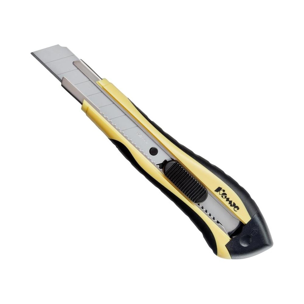 Канцелярский нож с сегментированным отламывающимся лезвием используется в канцелярии, при разрезании бумаг, картона, распечатывании корреспонденции и посылок, а также при ремонтных работах, не требующих больших усилий. Нож оснащен эргономичной рукояткой с противоскользящими вставками контрастного цвета. Металлическая направляющая из нержавеющей стали обеспечивает надежную фиксацию лезвия в момент использования. Корпус выполнен из пластика Сменное сегментированное лезвие из стали Система автоматической фиксации лезвия (Auto-lock) позволяет отрегулировать длину лезвия и закрепить его положение В комплекте два запасных лезвия (находятся в корпусе ножа) Количество рабочих сегментов 8 штук Схема замены лезвия: Снять с корпуса торцевую заглушку Извлечь из корпуса каретку Снять со шпинделя отработанное лезвие, установить новое Вставить каретку в направляющую и вернуть на место торцевую заглушку