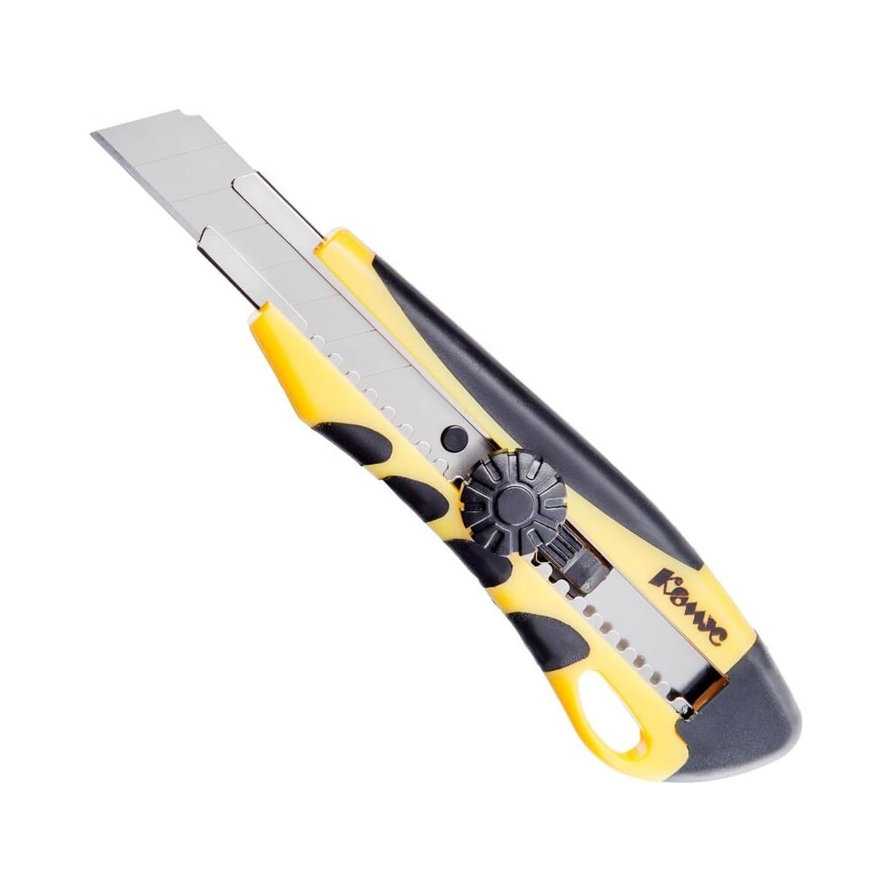 Канцелярский нож с сегментированным отламывающимся лезвием оснащен эргономичной рукояткой с противоскользящими вставками контрастного цвета. Металлические направляющие из нержавеющей стали обеспечивают надежную фиксацию лезвия в момент использования. Нож промышленного использования удобен для применения в строительстве, проведении ремонта. Корпус выполнен из пластика Сменное сегментированное лезвие из стали Надежный механизм фиксации лезвия— винтовой (Twist-Lock) Количество рабочих сегментов 8 шт. Схема замены лезвия: Открутить и снять роликовый фиксатор Снять со шпинделя отработанное лезвие, установить новое. Закрутить роликовый фиксатор