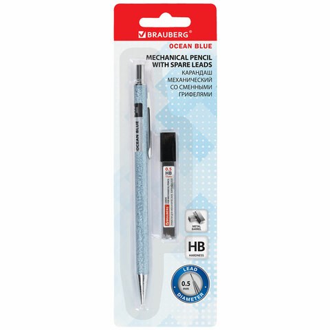 Карандаш механический 0,5 мм + грифели HB 12 штук на блистере, BRAUBERG "OCEAN BLUE", 181970
