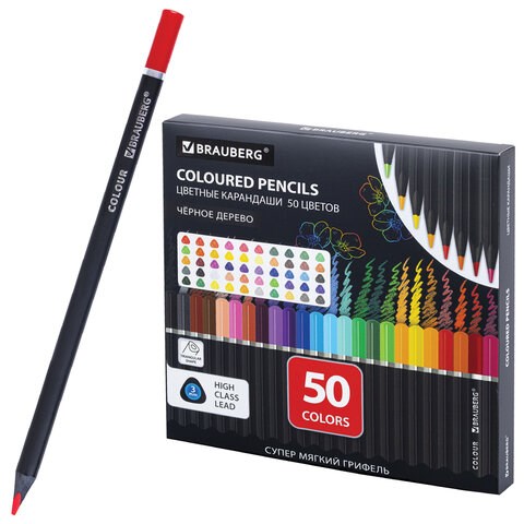 Карандаши цветные чёрное дерево BRAUBERG BLACK WOOD, 50 цветов, мягкий грифель 3 мм, 182043