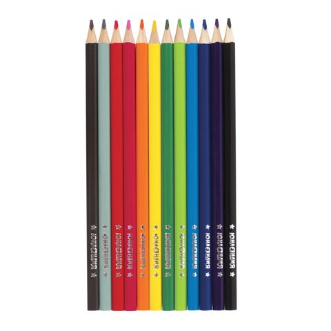 Набор состоит из 12 цветов: розовый, красный, желтый, оранжевый, салатовый, зеленый, голубой, синий, фиолетовый, коричневый, серый, черный. Яркие цвета развивают цветовосприятие ребенка. Трехгранная форма сечения корпуса позволяет не скатываться карандашу с поверхности стола во время занятий рисованием. Они изготовлены из древесины ценных пород и имеют лакированный корпус. Высокосортная древесина и качество исполнения гарантируют легкую заточку. Мягкий грифель качества "А" с диаметром 3 мм обладает повышенной прочностью, не ломается и не крошится при заточке. Все карандаши заточены и поставляются в картонной упаковке с европодвесом.