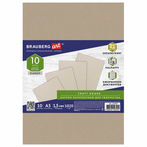 Картон переплетный, толщина 1,5 мм, А3 (297х420 мм), КОМПЛЕКТ 10 шт., BRAUBERG ART, 115337