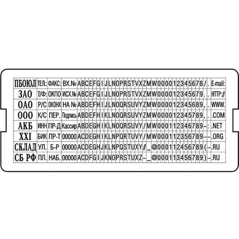 Содержит 312 символов, высота строчных букв 3,1, высота прописных букв 2,2 мм. Набор включает буквы, цифры и символы. Двухножечная система крепления обеспечивает надежность фиксации в текстовой плате штампа, а при необходимости легкую замену букв.