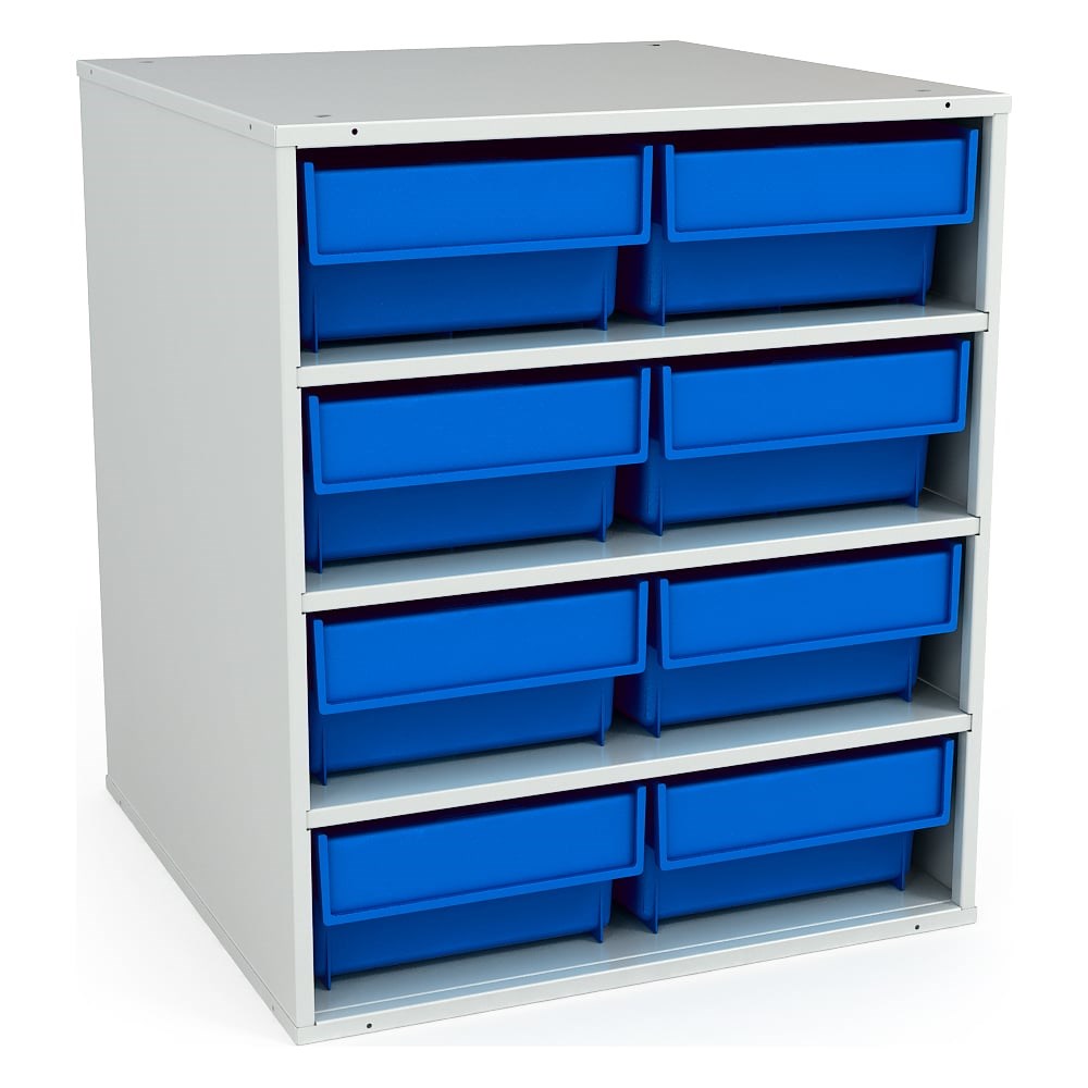 Кассета Диком К-01/1, 8 ящиков Б 400x185x100 мм, синие 18.2102-092 - сварная металлическая кассета с 8 пластиковыми ящиками Б 400х185х100 мм. Предназначена для компактного хранения большого количества метизов, компонентов, сыпучих веществ.